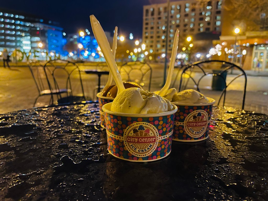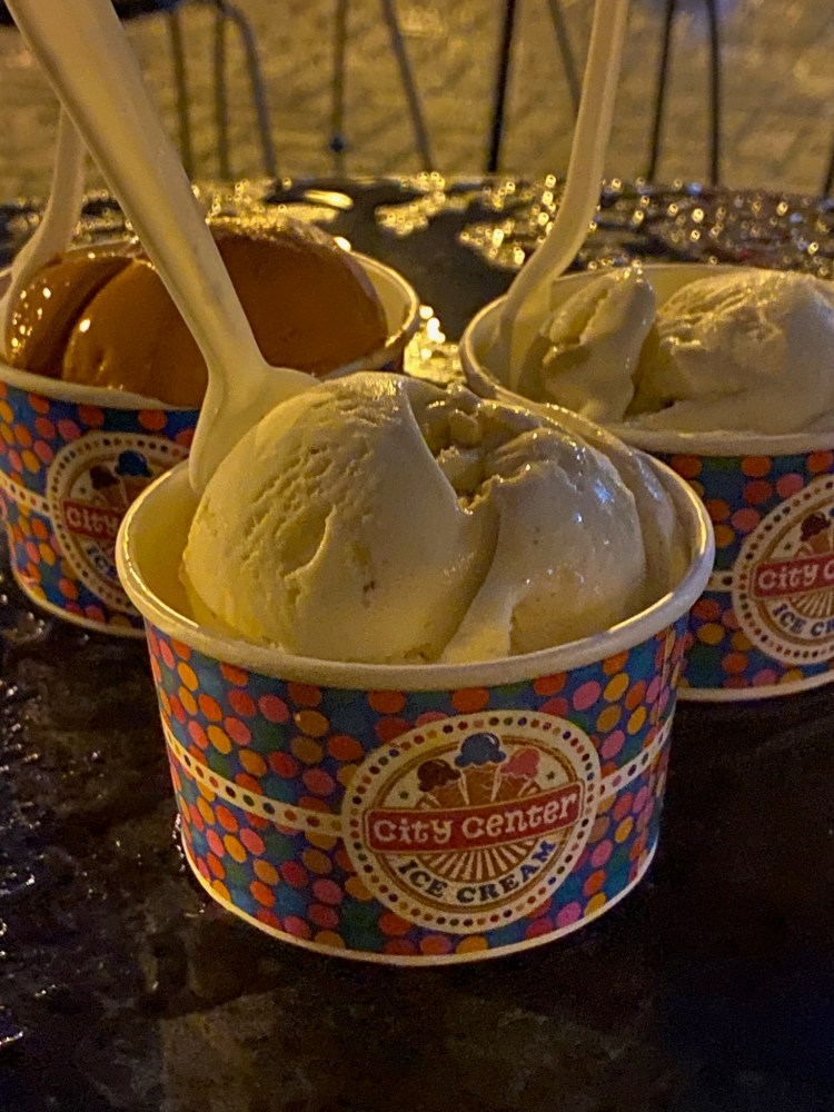The location is pretty conducive to outdoor ice cream consumption – there are lots of tables and chairs, and if you walk a short distance there’s a giant water fountain with lots of benches surrounding it. Would we recommend not going after a rainstorm? Probably. Since indoor seating is currently non-existent (due to the pandemic), outside seating is your only option. But never fear, we didn’t let wet chairs get in the way of our research!