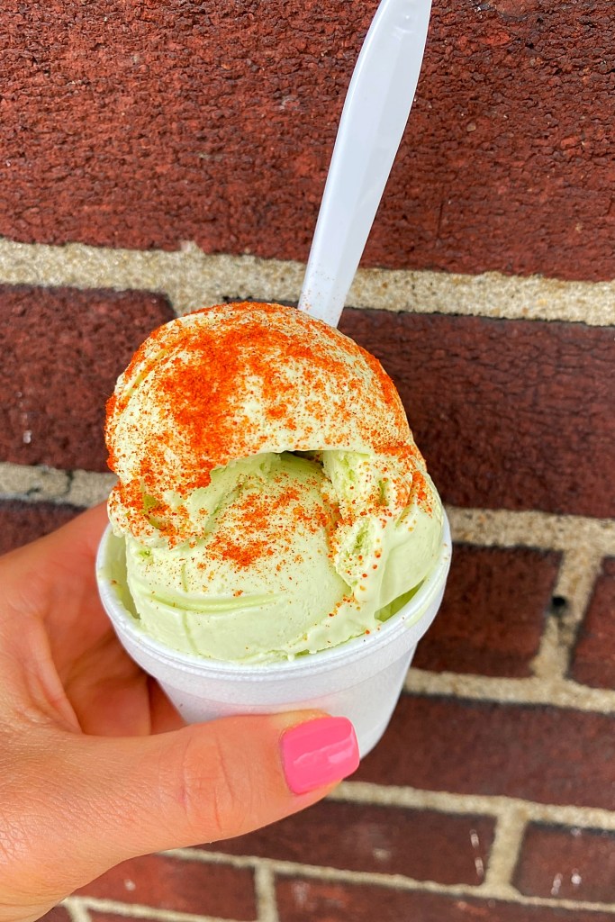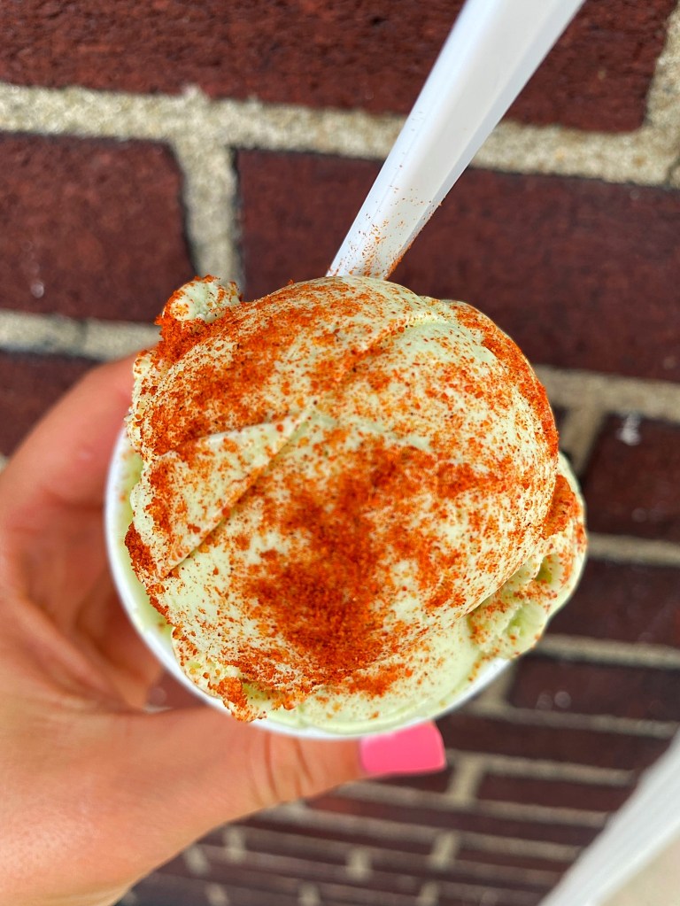 Avocado: When I saw this flavor on the menu, I knew I had to order it! Avocado is a pretty popular superfood so this ice cream is definitely healthy, right?? Haha! Anyway, I was very impressed with the smooth and sweet ice cream. It wasn’t overpowering in sweetness, but the perfect refreshing flavor for a hot day. I decided to get the suggested chili powder sprinkled on top, but honestly preferred the bites without the extreme chili taste and next time would order without.