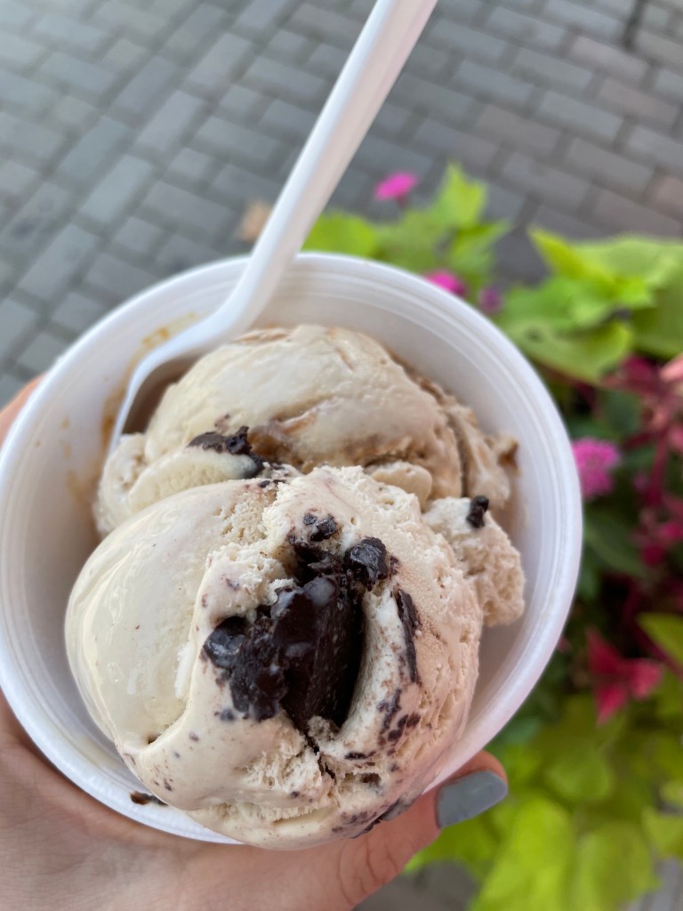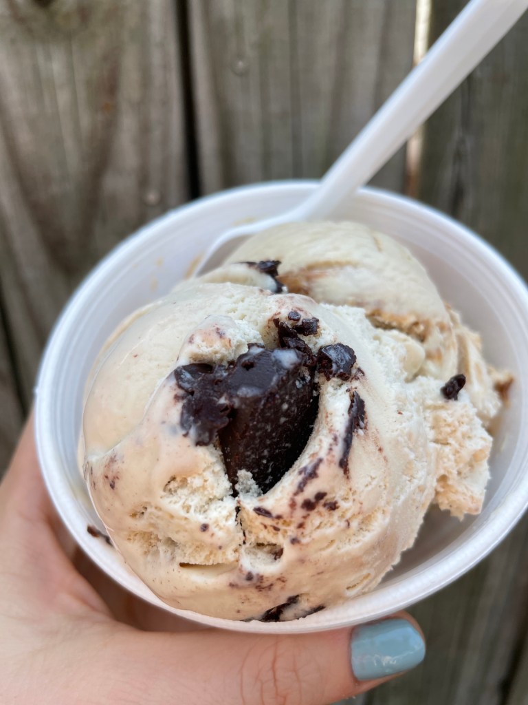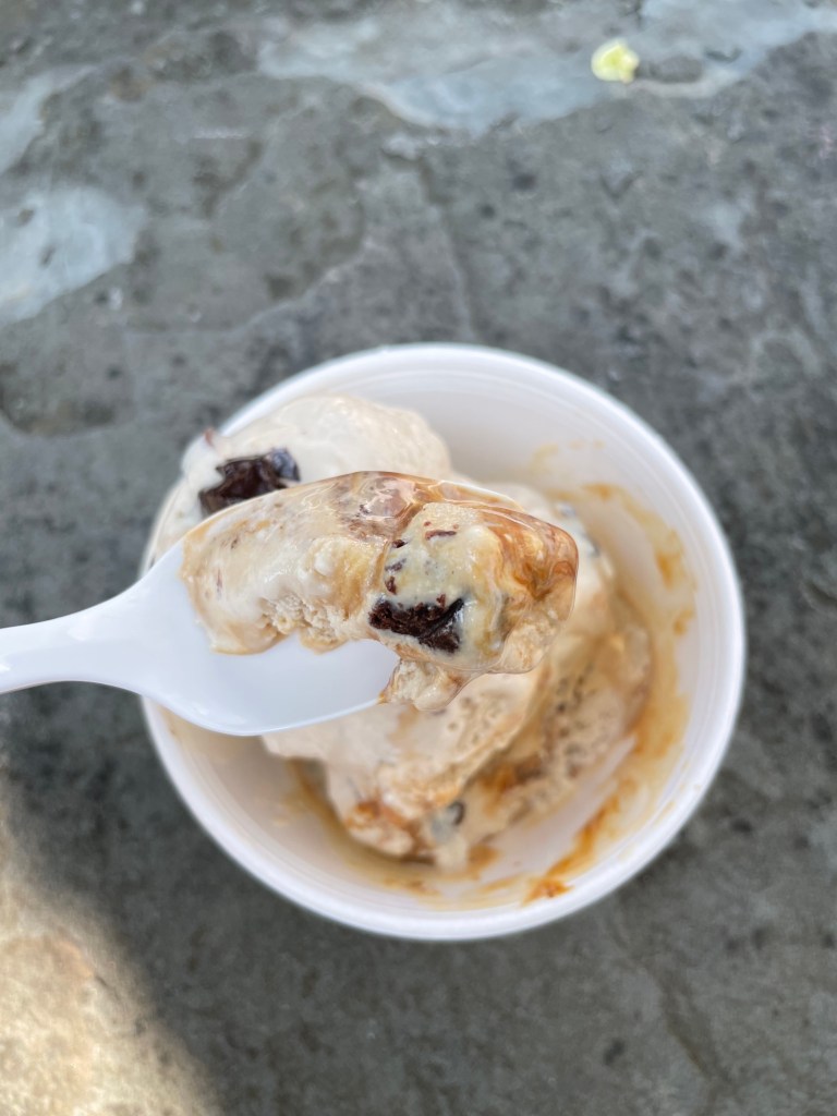 Jolted Cow: Besides for having a creative name, this flavor had an espresso sweet cream base, a salted caramel swirl, and chewy brownie pieces. It was quite good! The dominant flavor was definitely the salted caramel, but I did get notes of espresso as well. The salted caramel was so impressive – it was thick and swirled generously throughout the ice cream. The brownie pieces were a perfect size to add some chew and chocolatey-ness without dominating the flavor. This was my favorite flavor of the day!