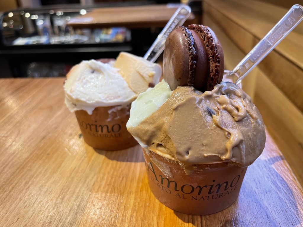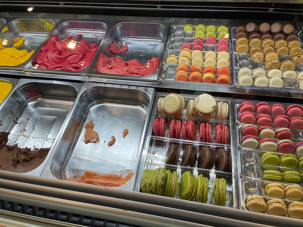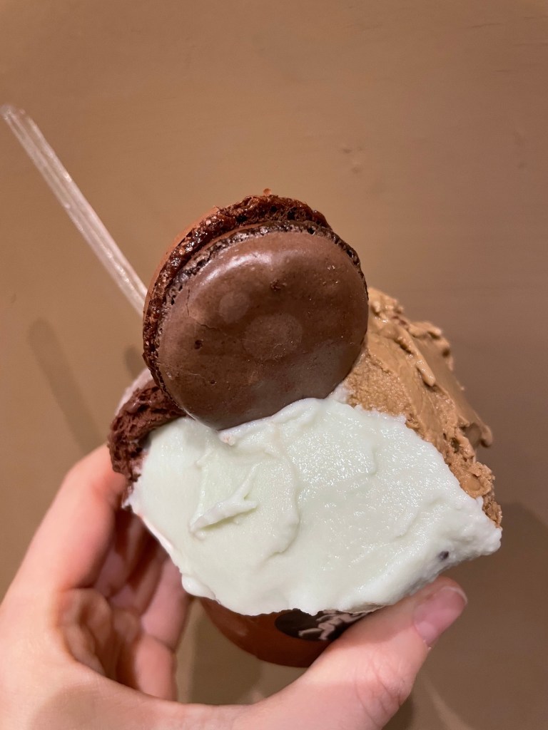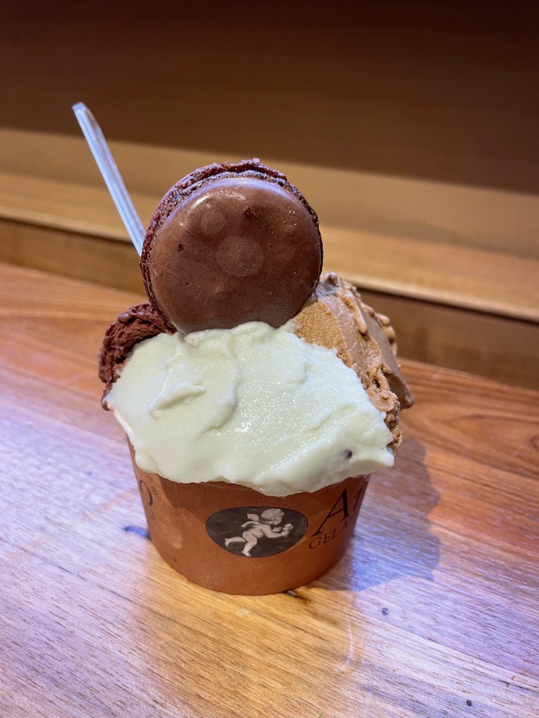 With all of the different flavors of gelato, it was hard to make a decision. We must have pondered all of the options for a solid eight minutes. Luckily, they allow for three flavors in a “classic” size cup, so that is exactly what we went for! And, you can also choose to get a macaron on top of the gelato as well, and of course we had to try it.