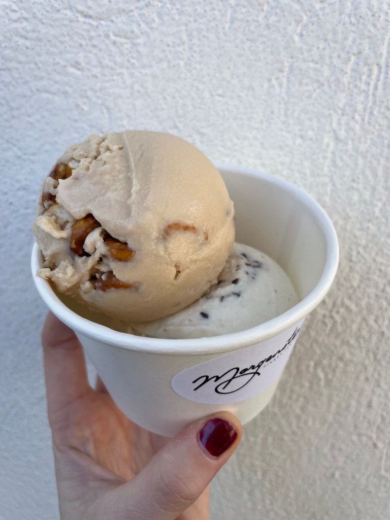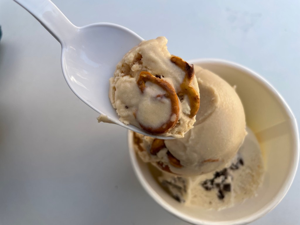 Salted Pretzel Caramel: This flavor was good! It had a very caramel-y base, that had a flavor similar to brown butter. The base was unique and slightly nutty-tasting, and paired well with the pretzels. Interestingly, the person scooping my ice cream put the pretzels in a container of the ice cream base, ground them up a bit, and then did the scoop. It led to pretzels of varied sizes, and we didn’t care for how large some of the pretzels were. Some mouthfuls ended up being ice cream with a normal sized pretzel. While we liked the base, as well as the salty/sweet combo of the base and pretzels, we didn’t like how the pretzels were large and seemed like an afterthought, as they were added to the ice cream base right before scooping.